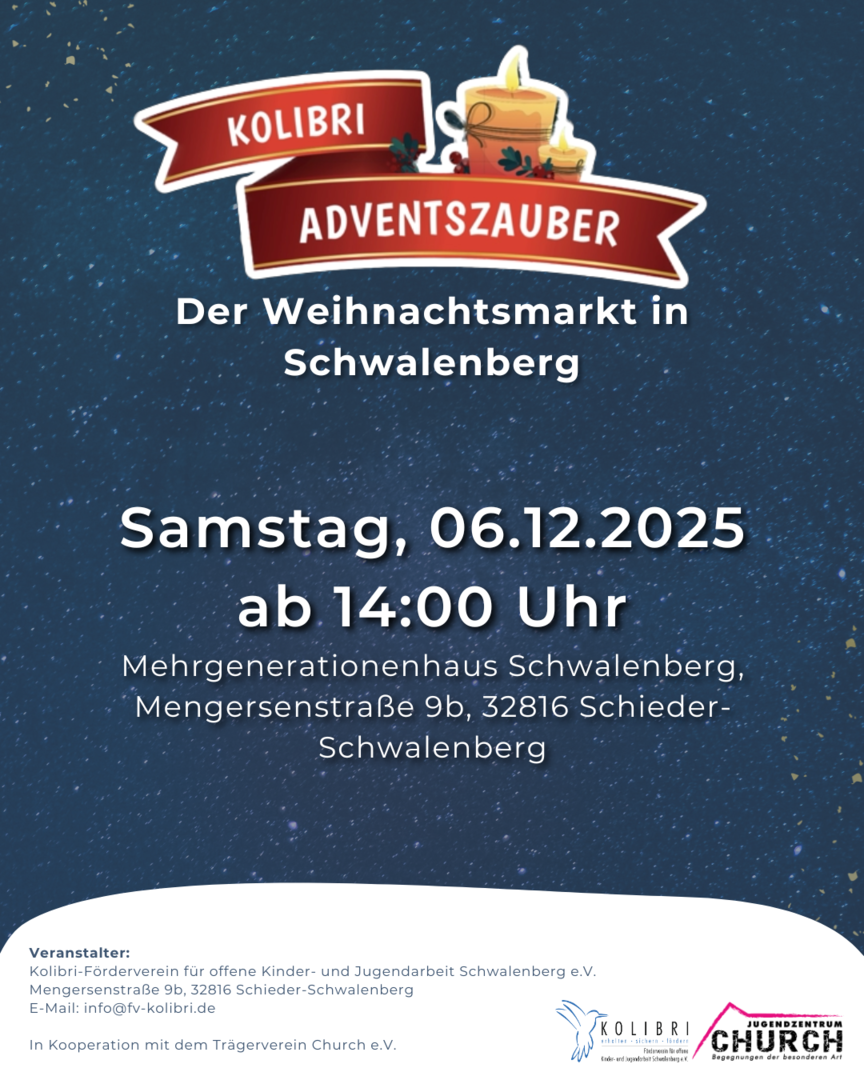 Am 06. Dezember 2025 lädt der Kolibri Adventszauber wieder zum stimmungsvollen Weihnachtsmarkt nach Schwalenberg ein! Freuen Sie sich auf festliche Atmosphäre, liebevoll dekorierte Stände und ein vielfältiges Programm für groß und klein.
