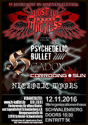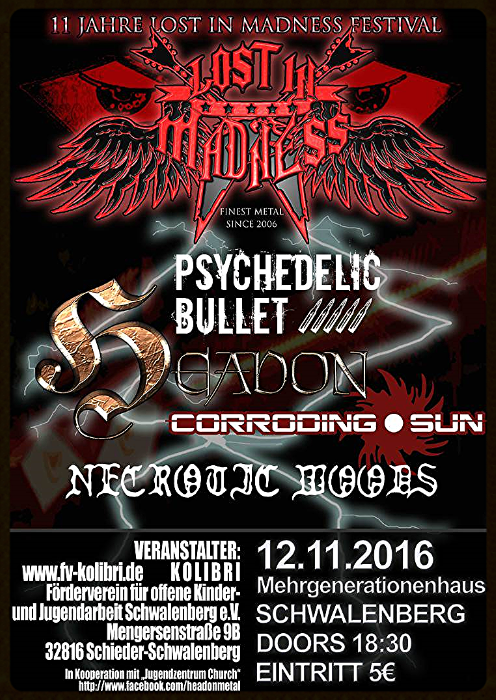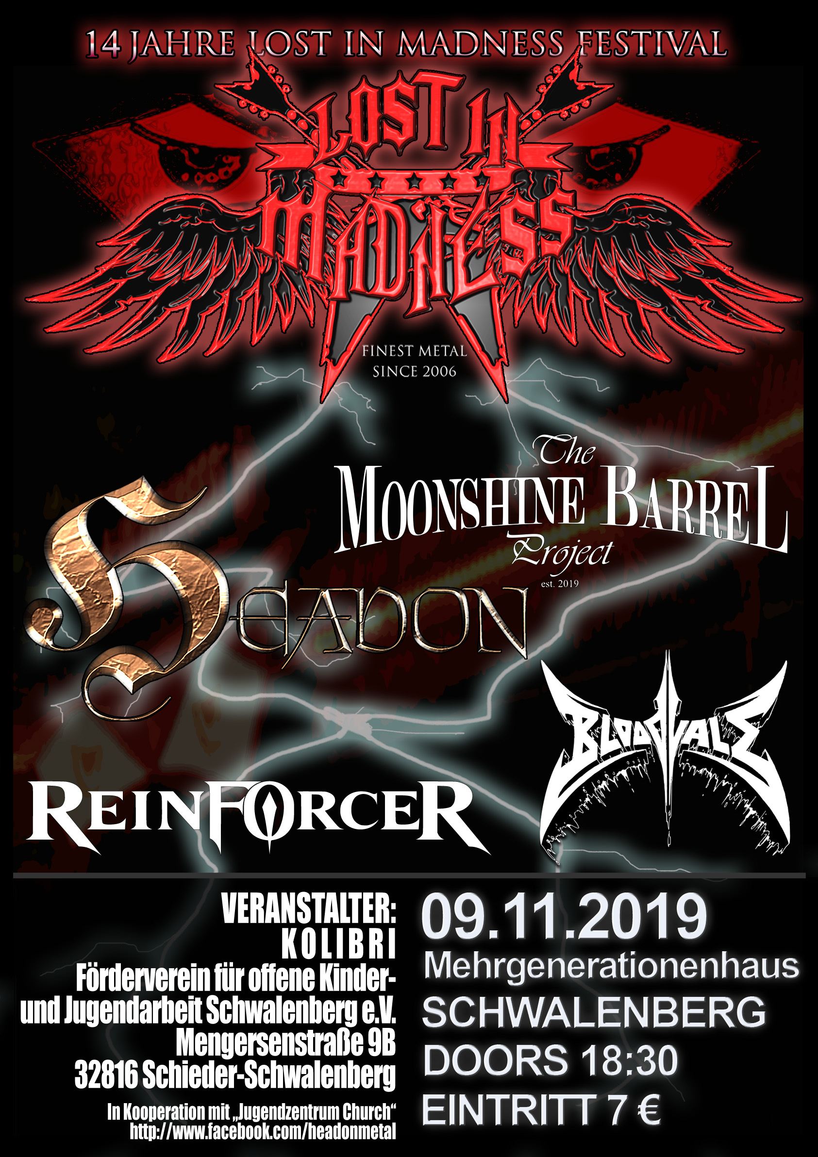 Am Samstag, den 08.11.2014 ab 18.30 Uhr findet im Mehrgenerationenhaus Schwalenberg wieder das berühmt-berüchtigte „Lost in Madness-Festval“ statt. Auch in diesem Jahr konnte federführend von der Band „Headon“ wieder ein gut besetztes Festival organisiert werden. Neben der Metal-Band „Headon“ spielen in diesem Jahr weitere 3 Gastbands für den „Kolibri-Förderverein auf. Als Gastbands können in diesem Jahr begrüßt werden: „Black Light Fire“ aus Höxter, „Poundshot“ aus Paderborn, „Huckleberry’s Wildest Dream“ aus Paderborn. Unterstützt wird die Veranstaltung von den Nachwuchsmitarbeitern (NAWUMIS) des Jugendzentrums Church. Einlass ist ab 18.30 Uhr. Der Eintritt beträgt 4,00 €. Wir würden uns freuen, wenn wir Euch/Sie als Gäste bei den etwas härten Klängen der Metal-Songs begrüßen dürfen.